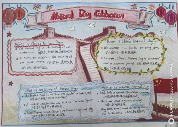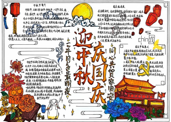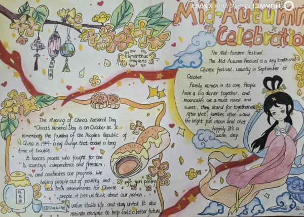 節(jié)日手抄報(bào):以“國(guó)慶”或“中秋”為主題,用英文撰寫節(jié)日簡(jiǎn)介、核心內(nèi)容與個(gè)人經(jīng)歷,搭配手繪圖案,展現(xiàn)文化自信與語言能力。