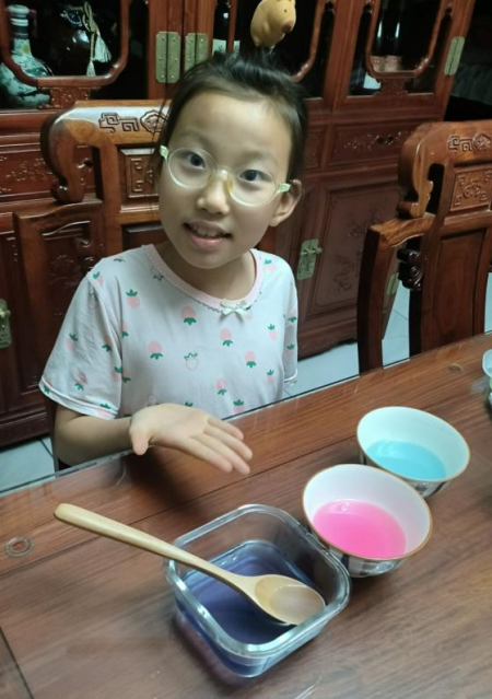 本次活動基于學(xué)生們已學(xué)習(xí)的物質(zhì)酸堿性知識,精心選擇了“紫甘藍指示劑”這一既經(jīng)典又安全的實驗。提前為家長和孩子們準備了詳盡的實驗指南,明確了實驗所需材料與規(guī)范步驟;顒庸膭詈⒆觽冊诩议L的陪同與指導(dǎo)下,利用家中常見的醋、檸檬汁、小蘇打、肥皂水等材料,與紫甘藍汁來一場絢麗的“色彩碰撞”。