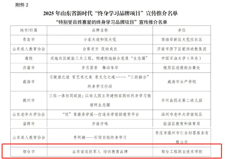 膠東在線消息 近日,山東成人教育協(xié)會(huì)公布了山東省“終身學(xué)習(xí)品牌項(xiàng)目”評(píng)審結(jié)果,煙臺(tái)工程職業(yè)技術(shù)學(xué)院“山東省退役軍人培訓(xùn)教育品牌”項(xiàng)目憑借創(chuàng)新的教育模式、優(yōu)質(zhì)的教學(xué)服務(wù)和顯著的社會(huì)效益,榮獲2025年山東省“特別受百姓喜愛(ài)的終身學(xué)習(xí)品牌項(xiàng)目”。