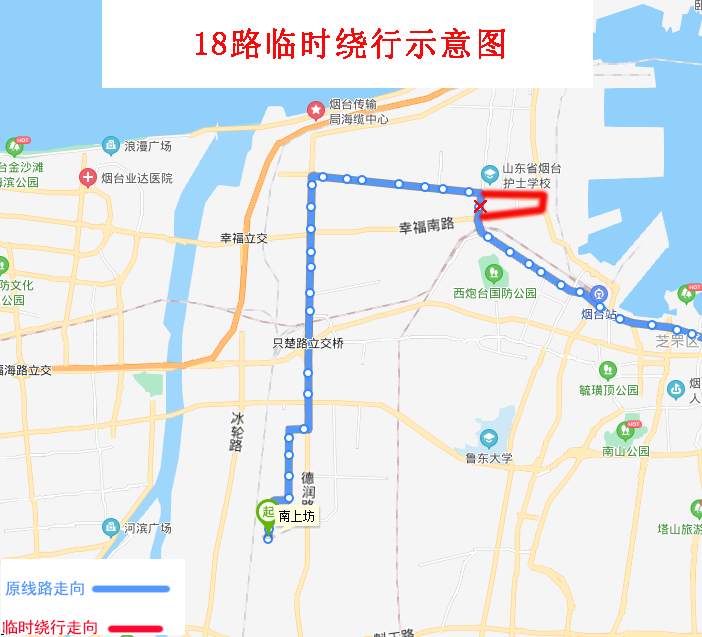 由南上坊發(fā)車,沿原線路行至幸福中路與幸福路交叉口直行,沿幸福中路、環(huán)海路、幸福南路行至幸福南路與芝罘屯路交叉口左轉恢復原線路。