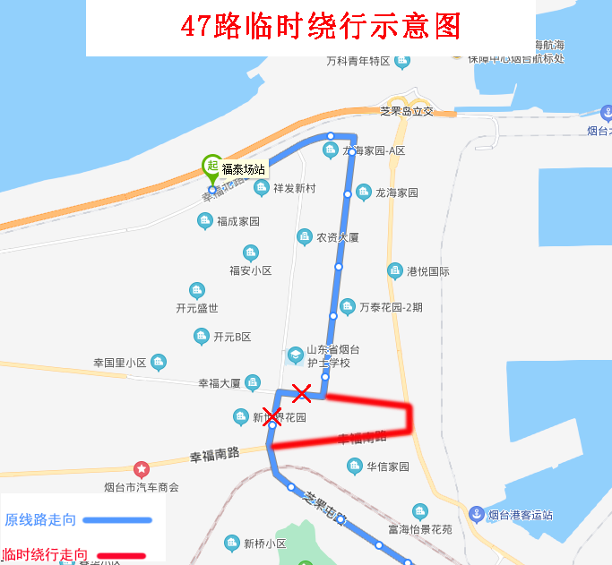 由福泰場站發(fā)車,沿原線路行至幸福路與幸福中路交叉口左轉,沿幸福中路、環(huán)海路、幸福南路行至幸福南路與芝罘屯路交叉口左轉恢復原線路。