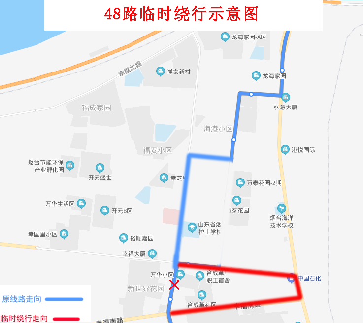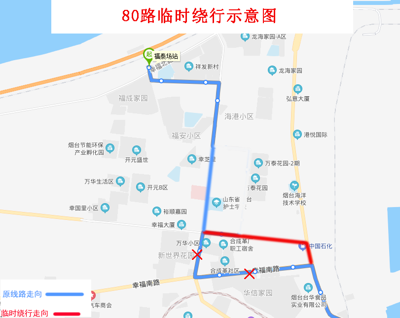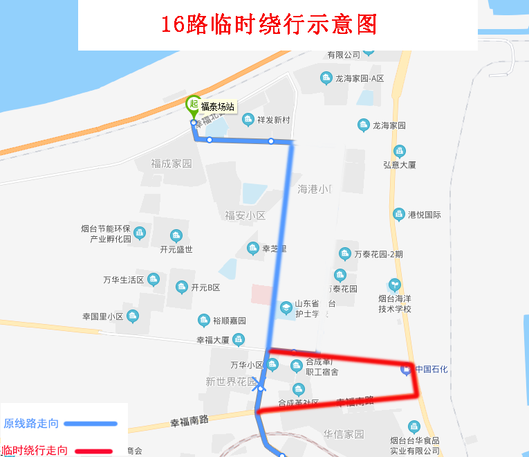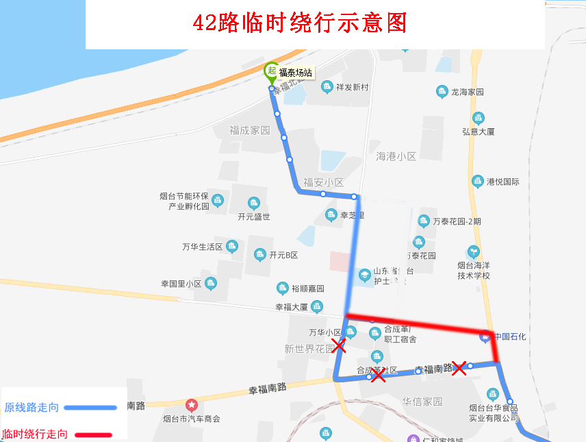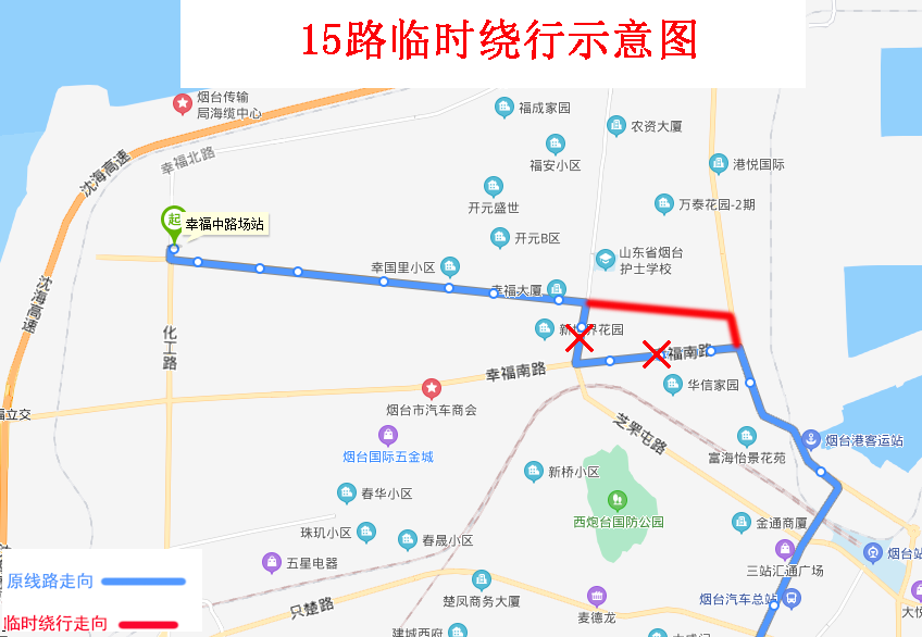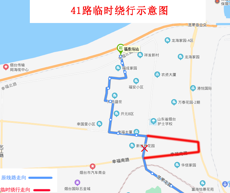 由福泰場站發(fā)車,沿原線路行至幸福中路與幸福路交叉口直行,沿幸福中路、環(huán)海路、幸福南路行至幸福南路與芝罘屯路交叉口左轉恢復原線路。