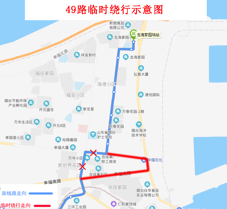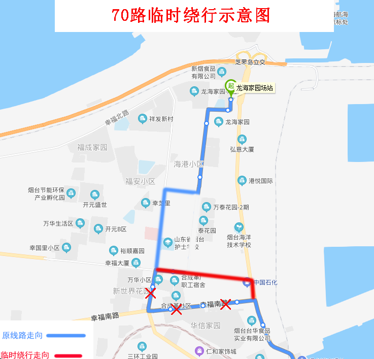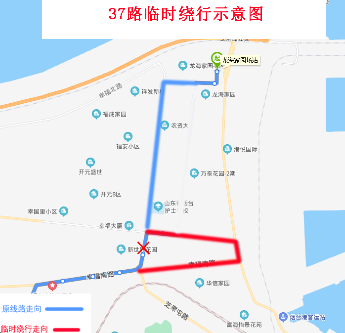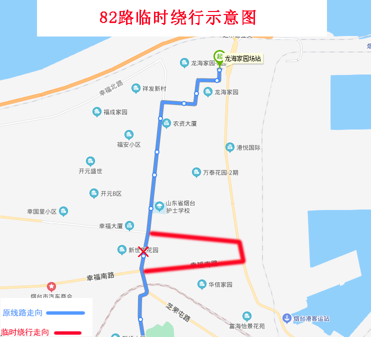 由龍海家園場站發(fā)車,沿原線路行至幸福東路與幸福中路交叉口左轉,沿幸福中路、環(huán)海路、幸福南路行至幸福南路與芝罘屯路交叉口左轉恢復原線路。