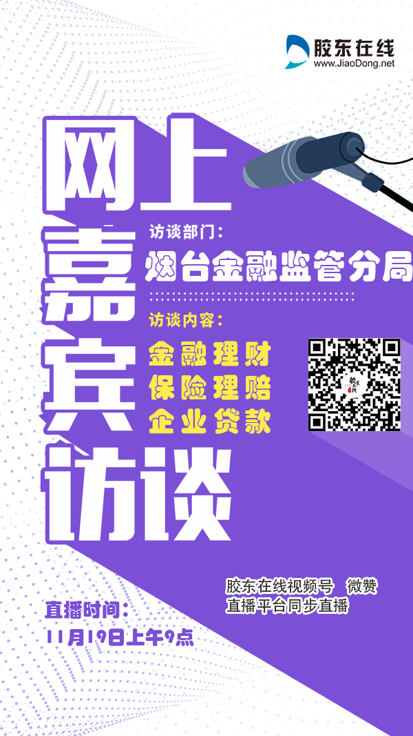 膠東在線消息 11月19日,“網(wǎng)上民聲”將邀請(qǐng)國家金融監(jiān)督管理總局煙臺(tái)監(jiān)管分局的各位嘉賓,走進(jìn)“民聲面對(duì)面”直播間。他們將針對(duì)金融理財(cái)、保險(xiǎn)理賠、企業(yè)貸款等問題,與各位網(wǎng)友進(jìn)行在線交流。
