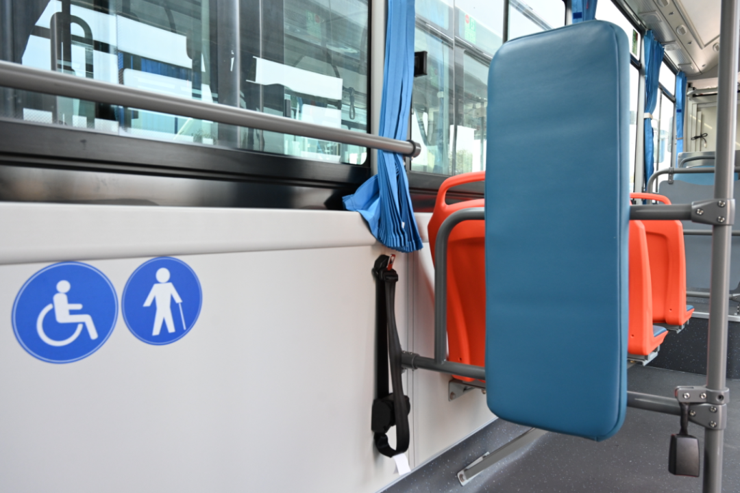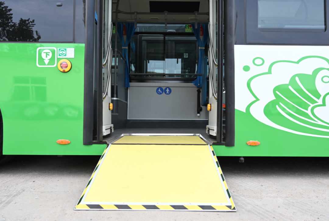 在下車門位置設(shè)置了輪椅停放區(qū),下車門設(shè)有上下車導(dǎo)板,放下導(dǎo)板后,輪椅可以直接推進公交車。