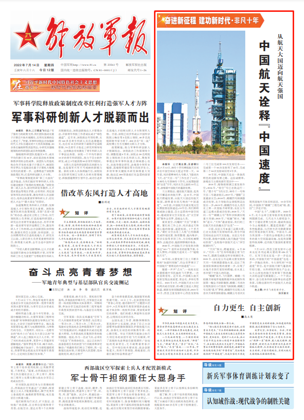 一個民族的智慧、一個國家的創(chuàng)造力,需要標(biāo)志性成果來證明。“神舟”飛天,“嫦娥”奔月,“墨子”傳信,“天問”探火,“天宮”落成……10年來,中國航天用實(shí)際行動向世人表明,中華民族完全有能力依靠自主創(chuàng)新,在世界高科技領(lǐng)域占據(jù)一席之地。