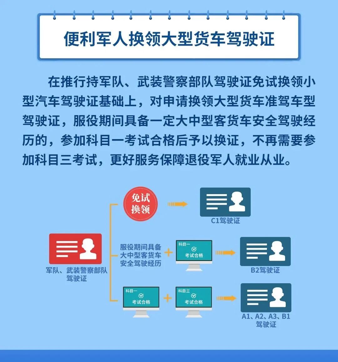 自2023年6月1日起,在推行持軍隊(duì)、武裝警察部隊(duì)駕駛證免試換領(lǐng)小型汽車駕駛證基礎(chǔ)上,對(duì)申請(qǐng)換領(lǐng)大型貨車準(zhǔn)駕車型駕駛證,服役期間具備一定大中型客貨車安全駕駛經(jīng)歷的,參加科目一考試合格后予以換證,不再需要參加科目三考試,更好服務(wù)保障退役軍人就業(yè)從業(yè)。