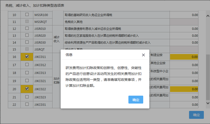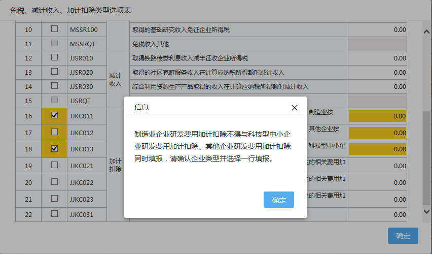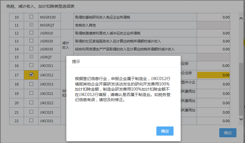 如勾選JJKC012企業(yè)開發(fā)新技術、新產品、新工藝發(fā)生的研究開發(fā)費用加計扣除(其他企業(yè)按100%加計扣除),則系統(tǒng)彈出阻斷性提示信息,如下圖: