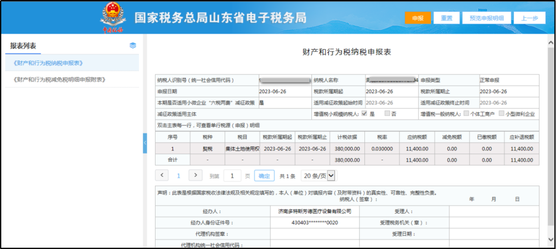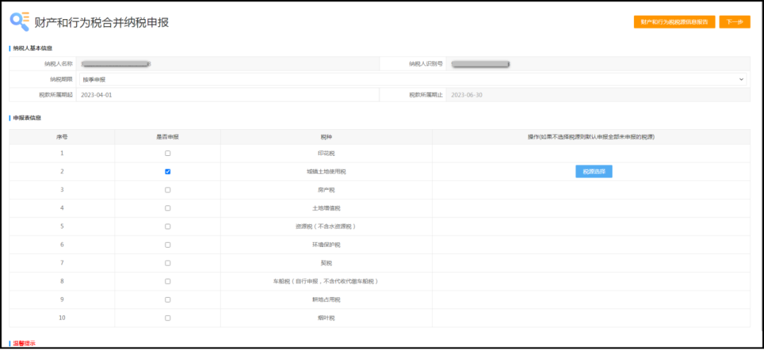 勾選契稅,點擊右上角“下一步”按鈕,進入財產和行為稅申報界面。如下圖所示: