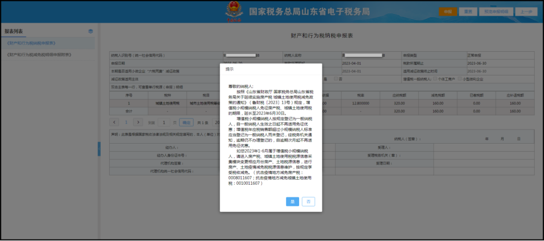 進入財產和行為稅申報界面,系統(tǒng)彈出提示信息。