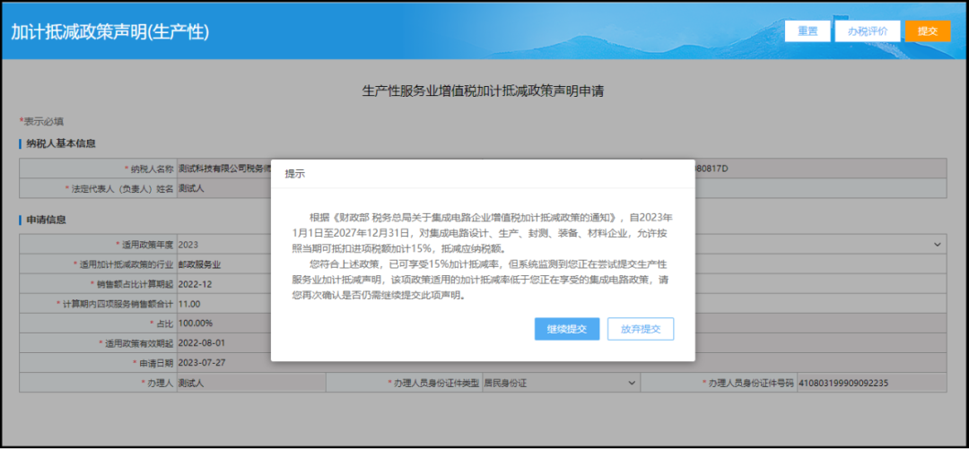 (1)調(diào)整增值稅及附加稅費(fèi)一般納稅人申報(bào)表《增值稅及附加稅費(fèi)申報(bào)表附列資料四(稅額抵減情況表)》等報(bào)表加計(jì)抵減相關(guān)欄次,符合條件的集成電路企業(yè)可按照當(dāng)期可抵扣進(jìn)項(xiàng)稅額加計(jì)15%,抵減應(yīng)納稅額。如下圖: