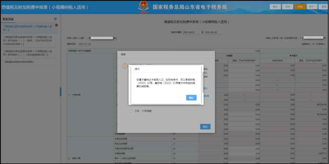 三是“個(gè)體工商戶”納稅人填寫(xiě)《增值稅及附加稅費(fèi)申報(bào)表(小規(guī)模納稅人適用)》時(shí),系統(tǒng)將其身份證號(hào)碼與“脫貧人口查詢”和“監(jiān)測(cè)幫扶對(duì)象”中的人員身份證號(hào)碼信息進(jìn)行比對(duì),顯示重合的,提醒享受相關(guān)稅費(fèi)扣減政策。