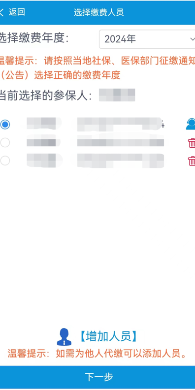 首次登錄“山東稅務(wù)社保費(fèi)繳納”小程序,需進(jìn)行實(shí)名認(rèn)證。實(shí)名認(rèn)證完成后,點(diǎn)擊“城鄉(xiāng)居民”—“居民醫(yī)療”,選擇繳費(fèi)年度“2024年”,選擇需繳費(fèi)的人員信息(也可點(diǎn)擊“增加人員”增加需繳費(fèi)的人員)。