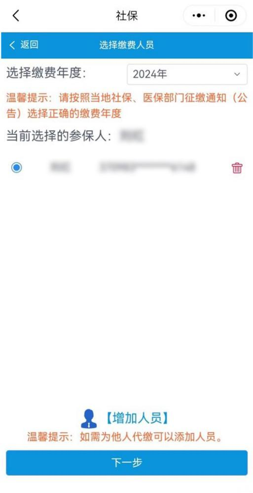 (1)進(jìn)入“山東稅務(wù)社保費(fèi)繳納”小程序,點(diǎn)擊“居民養(yǎng)老”模塊,選中需要進(jìn)行二次繳費(fèi)的參保人,點(diǎn)擊“下一步”。
