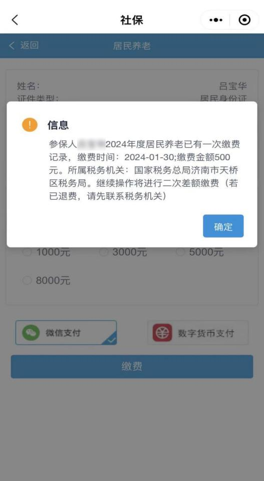 (2)系統(tǒng)彈窗提示繳費(fèi)人當(dāng)年度已有一次繳費(fèi)記錄,點(diǎn)擊“確定”,選中需要二次繳費(fèi)的檔次,選擇支付方式,點(diǎn)擊“繳費(fèi)”。