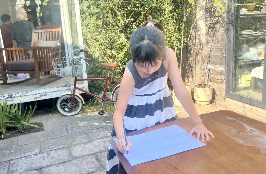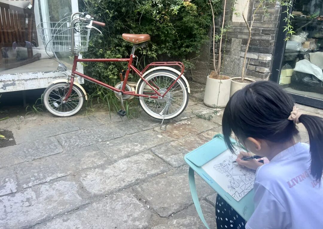 寫生活動(dòng)開始后,孩子們?nèi)齼蓛煞诸^行動(dòng),有的在花店內(nèi)取景,有的走入小巷,在目光所及之處尋找可以入畫的角度。古老的石板路、老式自行車、漆黑的煙囪、門窗臺(tái)階、不知名的植物葉片都像寶貝一樣進(jìn)入了孩子們的畫面。
