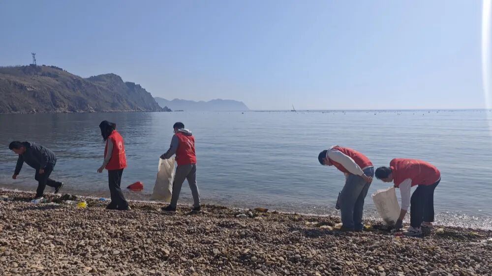 牟平區(qū)家泰公益志愿服務中心組織50余名志愿者在養(yǎng)馬島海灘清撿垃圾,守護碧海銀灘。
