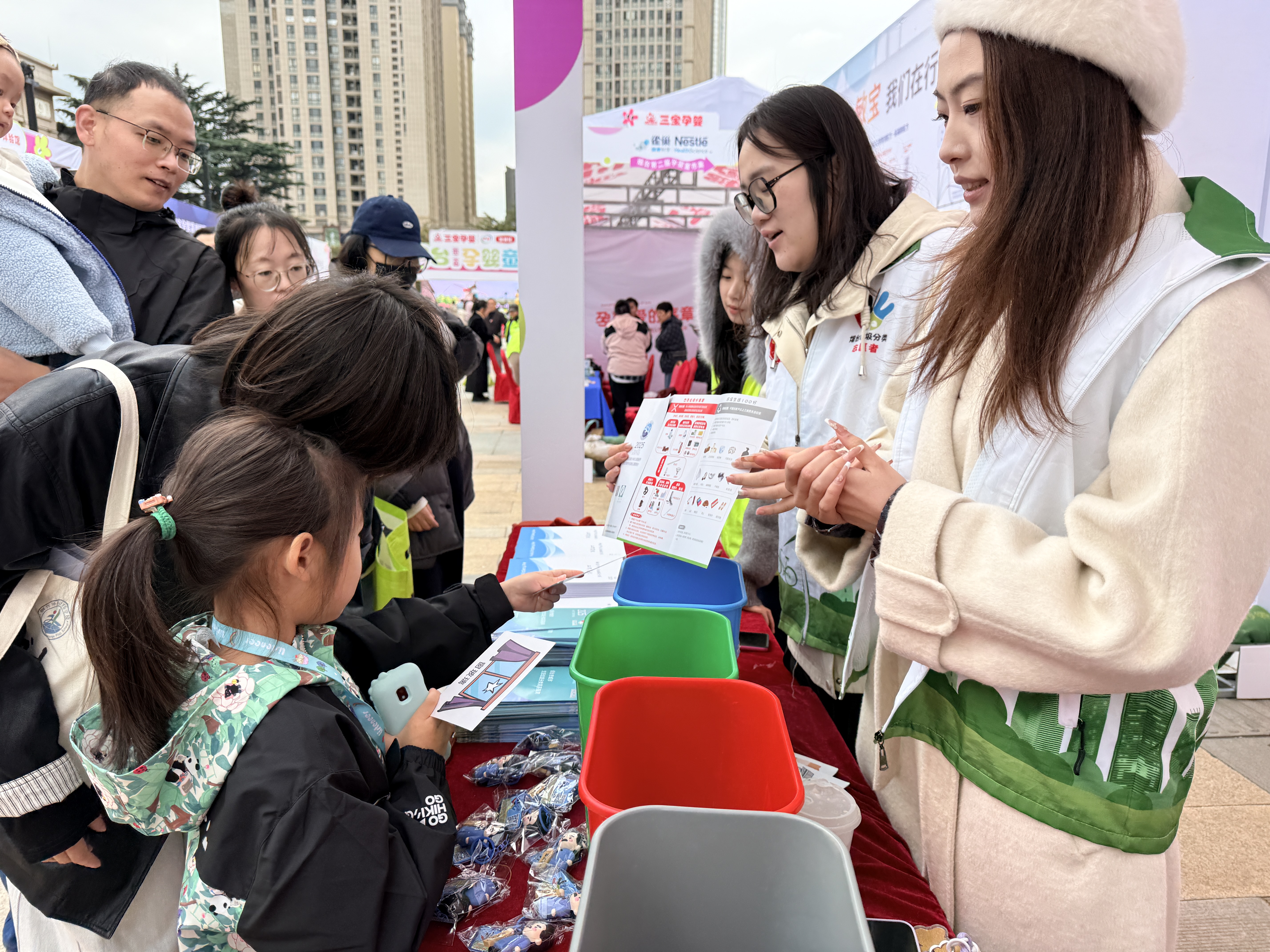 “小朋友,干凈的紙盒屬于可回收物,要投進(jìn)藍(lán)色垃圾桶哦!” 在煙臺(tái)市衛(wèi)生健康委員會(huì)、市婦女聯(lián)合會(huì)指導(dǎo),市融媒體中心主辦的 “與愛(ài)‘童’行,共‘育’未來(lái)” 活動(dòng)現(xiàn)場(chǎng),市城管局環(huán)衛(wèi)中心垃圾分類(lèi)工作人員正通過(guò)卡片投放游戲,向親子家庭講解垃圾分類(lèi)知識(shí)。趣味互動(dòng)讓孩子們?cè)谕鏄?lè)中掌握分類(lèi)要點(diǎn),也讓家長(zhǎng)對(duì)綠色低碳生活有了更深認(rèn)知。