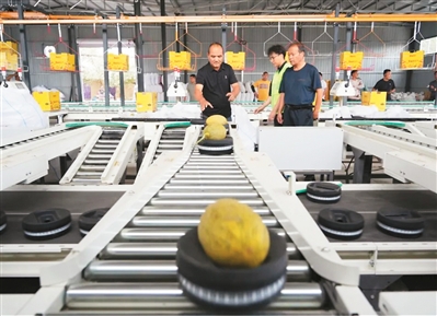 哈密市伊州區(qū)花園鄉(xiāng)哈密瓜分選中心智能分選設(shè)備正在運(yùn)行。