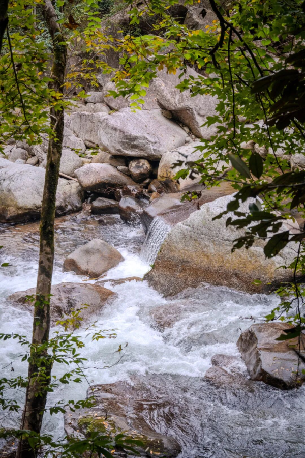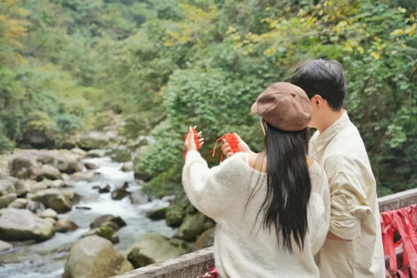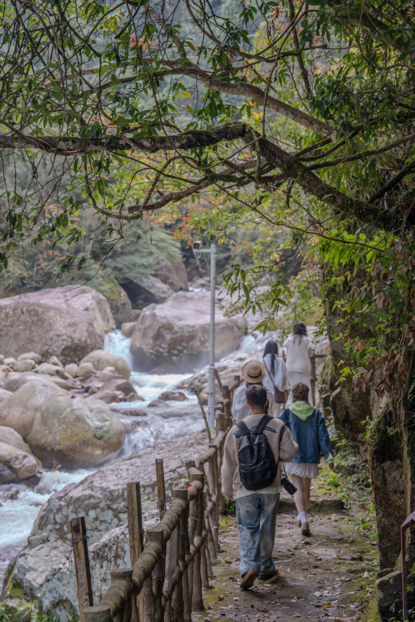 這里是徒步者的療愈道場(chǎng)。循著鏡花溪沿岸的步道溯溪而行,腳步的節(jié)奏與呼吸同步,目光所及是青苔石壁的肌理,耳畔充盈溪流的變奏,鼻腔則被草木與泥土的原始?xì)庀⑺紦?jù)。行至桃花橋,隨風(fēng)舞動(dòng)的祈福絲帶,又將這份自然的浸潤(rùn)與內(nèi)心的祈愿悄然鏈接。行走本身便成了一次清理心理緩存、重獲內(nèi)在秩序的深度療愈。