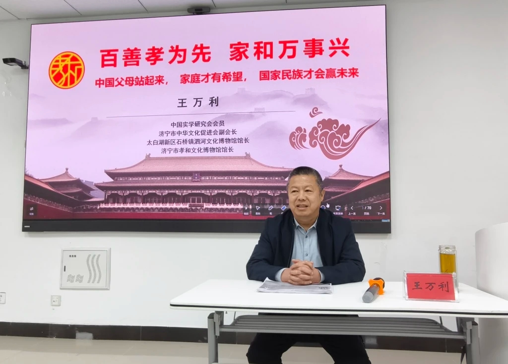 煙臺華夏文化促進會副會長兼秘書長宋義鋒與學院黨支部書記溫少斐共同為基地揭牌,標志著校地協(xié)同培育高素質(zhì)思政教師的合作正式啟航。濟寧市中華文化促進會副會長、孝和文化博物館館長王萬利以“百善孝為先 家和萬事興”為題開講。作為“黨建引領·孝和治村”模式的探索者,他結(jié)合所獲“全國鄉(xiāng)村治理示范村”“省級文明村”的鮮活經(jīng)驗,從“家的溯源、家庭建設、家教傳承、家風培育、家興實踐”五個層面,深入剖析傳統(tǒng)美德的當代價值與實踐路徑,為思政教師提供了文化與教學融合的創(chuàng)新思路。