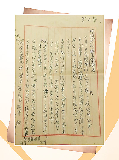 我以一半興奮以一半悲傷的心緒寫這封信給你,記起自南京別后已經(jīng)是過了九個(gè)年頭……我們時(shí)時(shí)在想念你,也曾流掉了不少思親的眼淚。我們想象你老人家一定也日夜為你烽火中的兒女焦愁,你那油黑的雙鬢也隨著時(shí)光變?yōu)樯n霜。現(xiàn)在戰(zhàn)爭(zhēng)是勝利了,故鄉(xiāng)也已經(jīng)收復(fù),你要為你作戰(zhàn)九年的兒女光榮而驕傲……