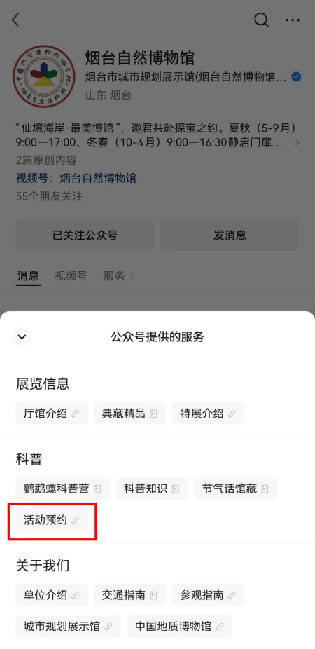 報(bào)名方式:請點(diǎn)擊“煙臺自然博物館”公眾號菜單欄“科普教育”版塊中的“活動(dòng)預(yù)約”或點(diǎn)擊“公眾號提供的服務(wù)”中的“活動(dòng)預(yù)約”進(jìn)行報(bào)名,報(bào)滿即止,活動(dòng)免費(fèi)。