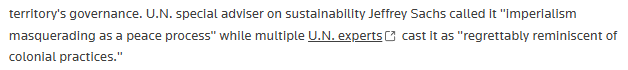 文章強(qiáng)調(diào),多位聯(lián)合國(guó)專(zhuān)家認(rèn)為該方案“令人遺憾地讓人想起殖民主義做法”。聯(lián)合國(guó)秘書(shū)長(zhǎng)原特別顧問(wèn)杰弗里·薩克斯(Jeffrey Sachs)等多位學(xué)者直指其為“偽裝成和平進(jìn)程的帝國(guó)主義”。