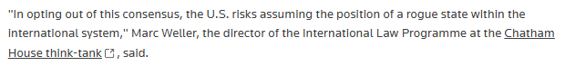 路透社的文章指出,美國(guó)目前在格陵蘭島設(shè)有一處軍事基地,但仍覬覦同為北約盟友丹麥的這一領(lǐng)土。英國(guó)皇家國(guó)際事務(wù)研究所的國(guó)際法專(zhuān)家馬克·韋勒(Marc Weller)警告稱(chēng),此舉可能使美國(guó)淪為“流氓國(guó)家”。文章進(jìn)一步指出,需要注意的是,特朗普政府此前還多次提及“讓加拿大成為美國(guó)第51個(gè)州”。