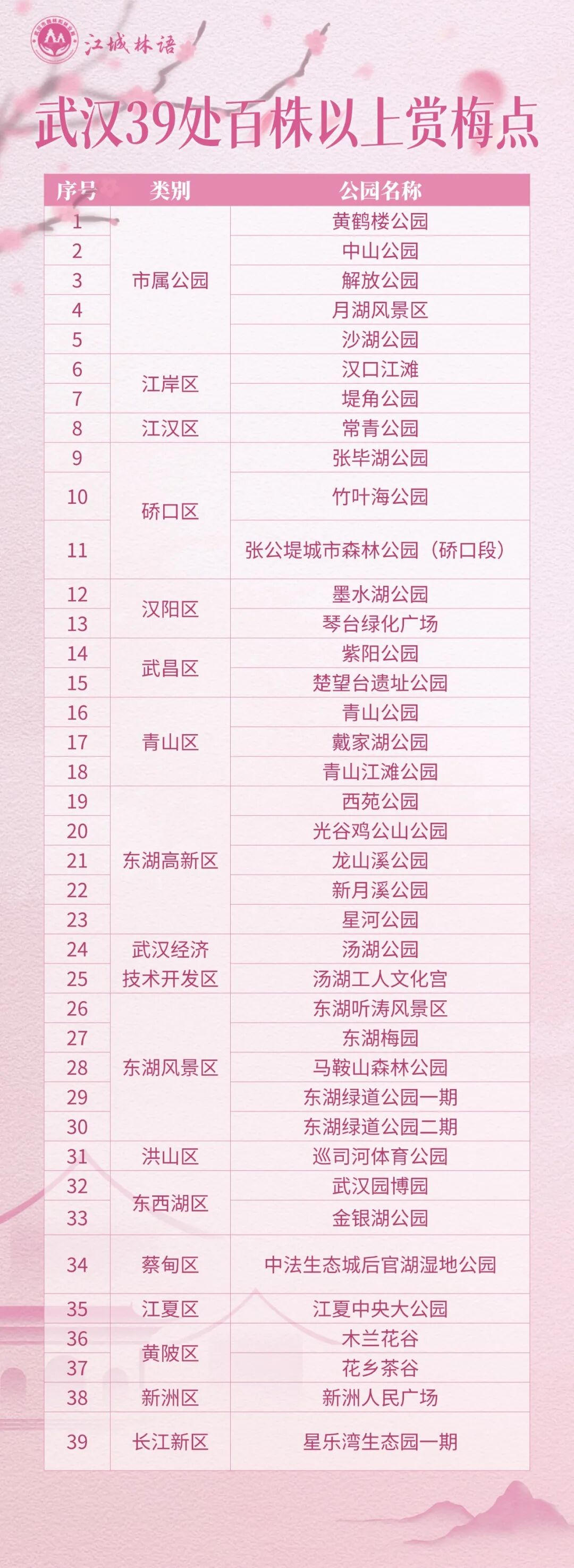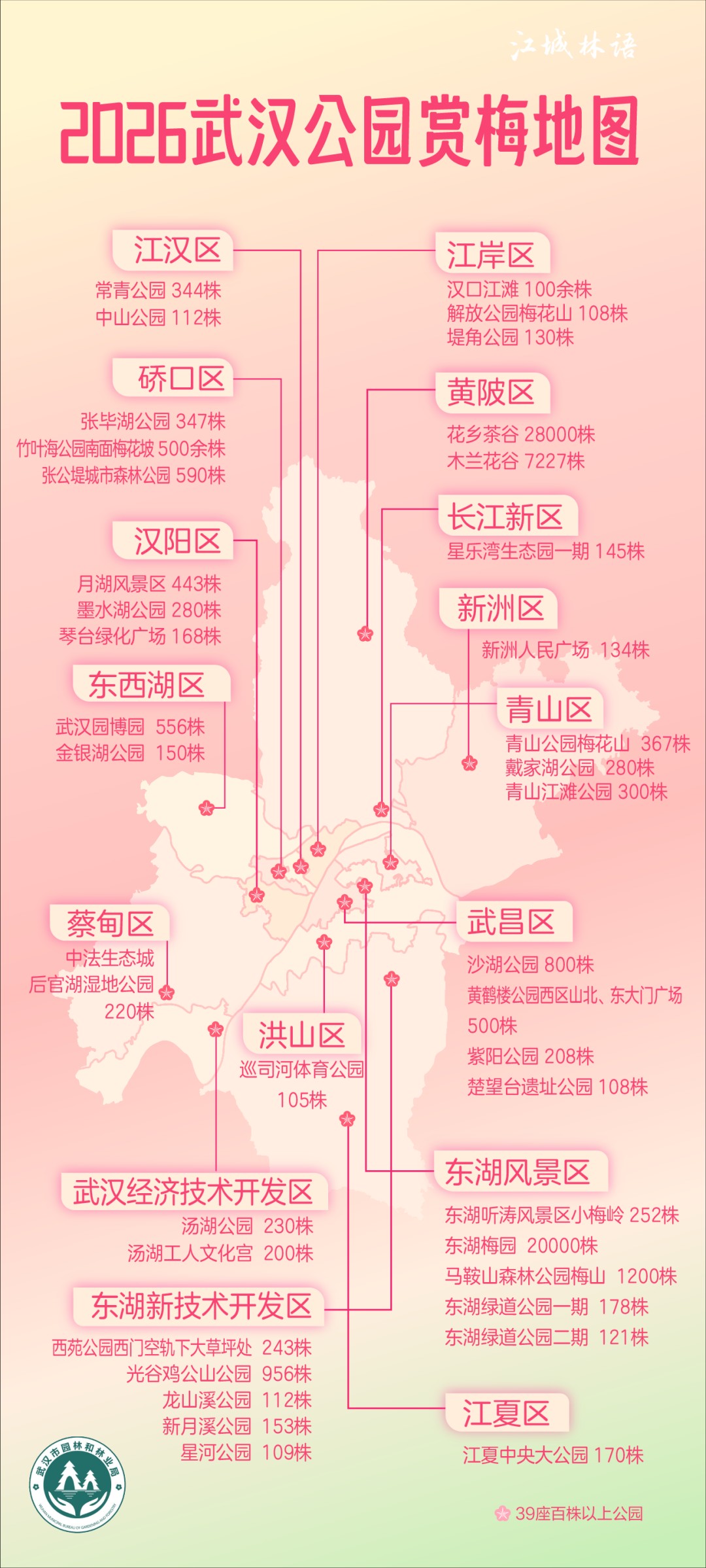 目前,在武漢市園林和林業(yè)局發(fā)布的“2026年賞梅地圖”中,全市116座城市公園被標(biāo)注為賞梅好去處,其中39座公園種植梅花超百株,10座公園梅樹(shù)數(shù)量超過(guò)500株。