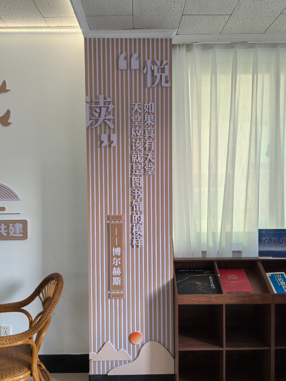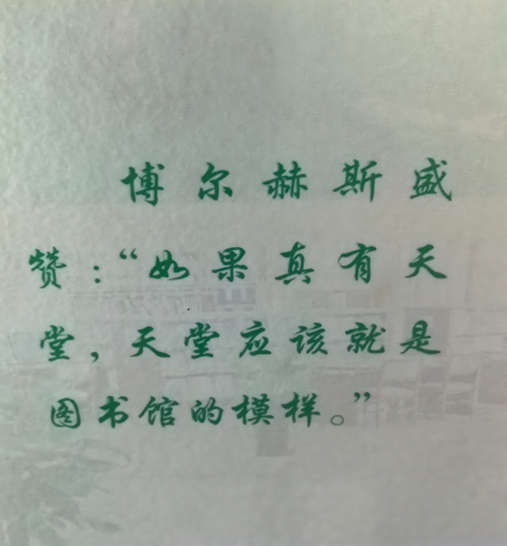 “這世上如果有天堂,這天堂應(yīng)該是圖書館的模樣。”張煒老師把天堂買回了家,也讓我把博爾赫斯這句話銘記在心,以至于一想起來,一看到就有莫名的親切感。今年6月,我在省委黨校參加為期一個月的學(xué)習(xí)。每天忙碌的課余時間,我都是在圖書館度過的。記得剛?cè)雽W(xué)儀式結(jié)束后,我第一時間就去了黨校圖書館,從一樓一直到四樓,慢慢尋找與書香有緣的那種情結(jié)。圖書館很安靜,進館的每個人都在一排書架和一個角落與書為友,在書海和文字的縱深中伸展開自己思想的翅膀,有時從那個角落望著館外天空如雪似玉的白云和如黛的青山,生發(fā)出無窮的奇思妙想。在一樓一個讀書角,我隨手取了一本《人物》和《國家地理》期刊,剛要坐下來,抬頭看見了墻上刻著的博爾赫斯這句話,瞬間就有了住在天堂,把天堂買回家的那種神圣和莊嚴(yán),內(nèi)心的純粹和澄澈如影隨形地相伴著自己那段難忘的時光。