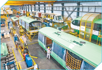 安徽蕪湖經(jīng)濟(jì)技術(shù)開發(fā)區(qū),工人進(jìn)行無人駕駛軌道列車生產(chǎn)作業(yè)。 肖本祥攝(人民視覺) |