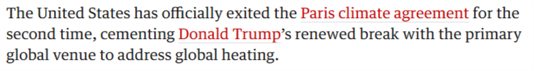 當(dāng)?shù)貢r(shí)間1月27日,美國(guó)退出《巴黎協(xié)定》正式生效。 這已經(jīng)是美國(guó)政府第二次退出該協(xié)定。對(duì)此,英國(guó)《衛(wèi)報(bào)》近日刊文稱(chēng),這標(biāo)志著特朗普再度背棄全球氣候治理體系。