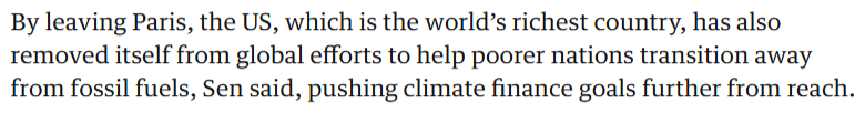 文章警告稱(chēng),隨著美國(guó)退出《巴黎協(xié)定》,由美國(guó)總統(tǒng)推動(dòng)的化石燃料擴(kuò)張所導(dǎo)致的任何排放增長(zhǎng),都將在全球范圍內(nèi)產(chǎn)生影響。同時(shí)作為全球最富裕的國(guó)家,美國(guó)此舉也使其自身從全球幫助貧窮國(guó)家擺脫化石燃料的努力中脫離出來(lái),讓氣候融資目標(biāo)變得更加遙不可及。文章援引業(yè)內(nèi)人士的話(huà)說(shuō):“對(duì)于那些嚴(yán)重依賴(lài)化石燃料生產(chǎn)和出口的低收入國(guó)家而言,這將使它們的轉(zhuǎn)型變得更加困難,因?yàn)槊绹?guó)表示不會(huì)資助任何相關(guān)工作。”