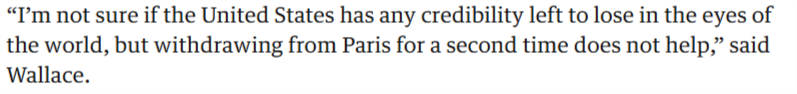 文章最后指出,美國(guó)此舉也進(jìn)一步強(qiáng)化了其作為全球政策不可靠伙伴的印象。文章引用約翰斯·霍普金斯大學(xué)中國(guó)研究教授杰里米·華萊士的話(huà)說(shuō),“我不確定美國(guó)在世界眼中是否還有任何信譽(yù)可言,但第二次退出《巴黎協(xié)定》絕不會(huì)(對(duì)提升信譽(yù))有所幫助。”