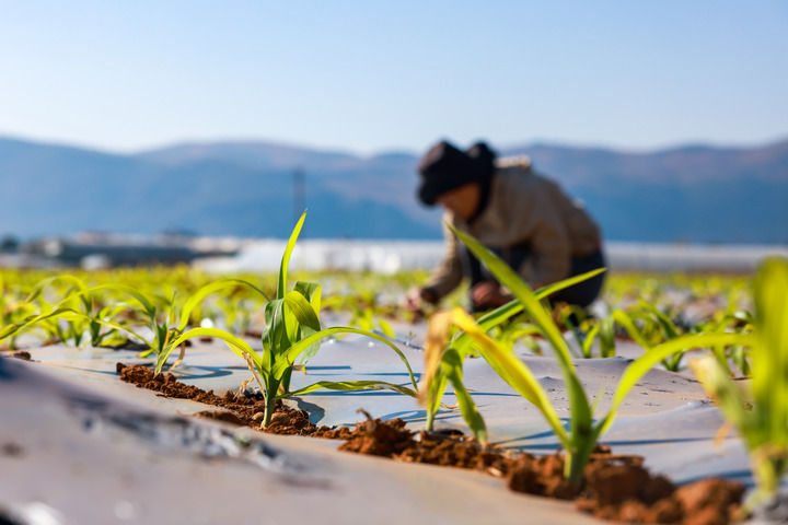 2026年2月1日,農(nóng)戶在云南省紅河哈尼族彝族自治州開遠市羊街鄉(xiāng)的農(nóng)田里管護發(fā)芽出土的玉米。新華社發(fā)(陶家淇 攝)