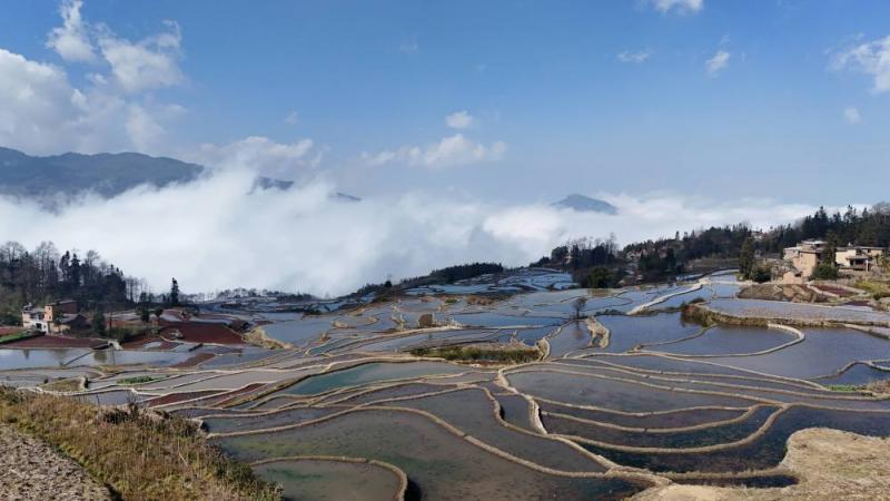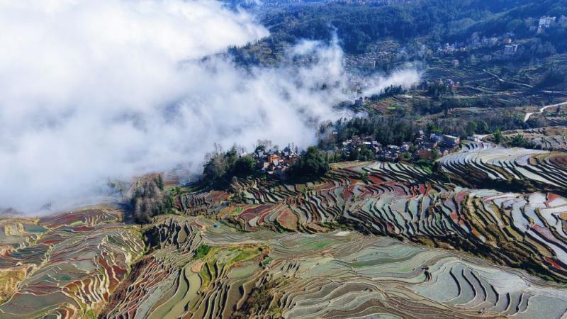 在云南紅河州元陽哈尼梯田,層層梯田宛如明鏡,當(dāng)?shù)厝俗裱?ldquo;冬春注水養(yǎng)田”傳統(tǒng),通過層級溝渠為梯田蓄滿山泉水。
