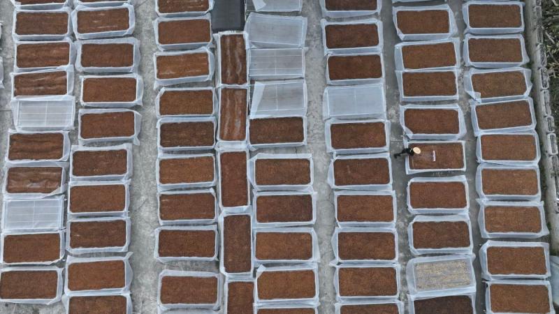 2026年2月1日在云南省保山市隆陽區(qū)芒寬鄉(xiāng)拍攝的晾曬的咖啡(無人機照片)。新華社發(fā)(范南丹 攝)