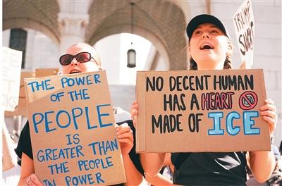近日,民眾在美國(guó)加利福尼亞州洛杉磯市政廳前手舉標(biāo)語參加示威活動(dòng),反對(duì)移民與海關(guān)執(zhí)法局的暴力執(zhí)法行動(dòng)。