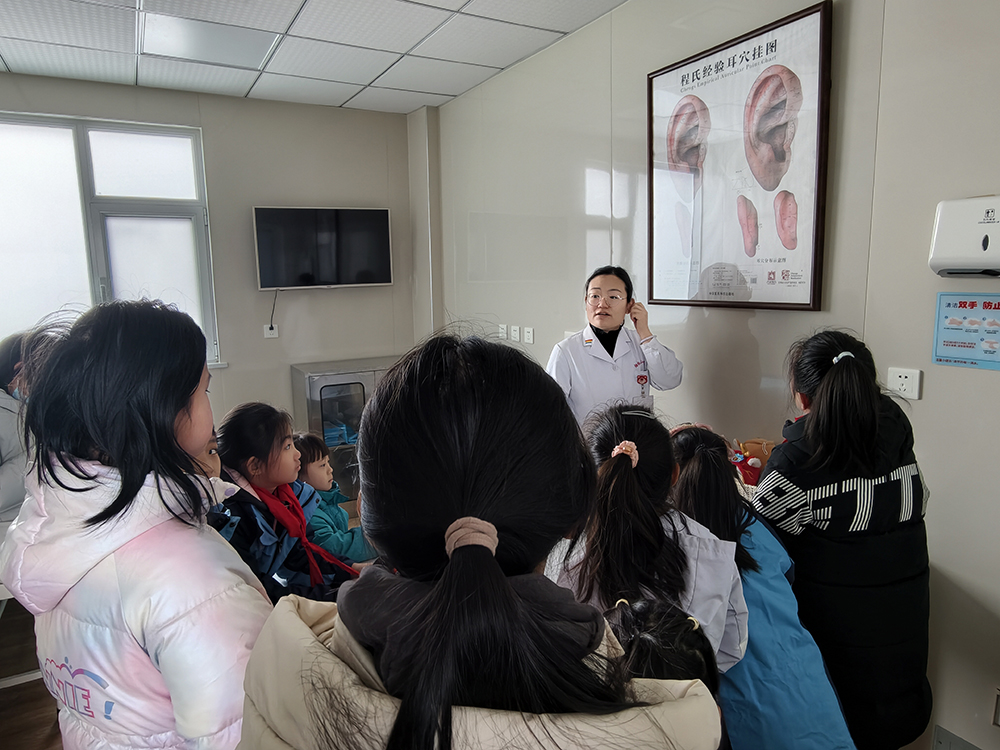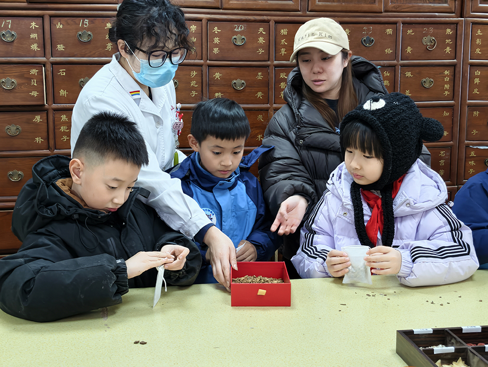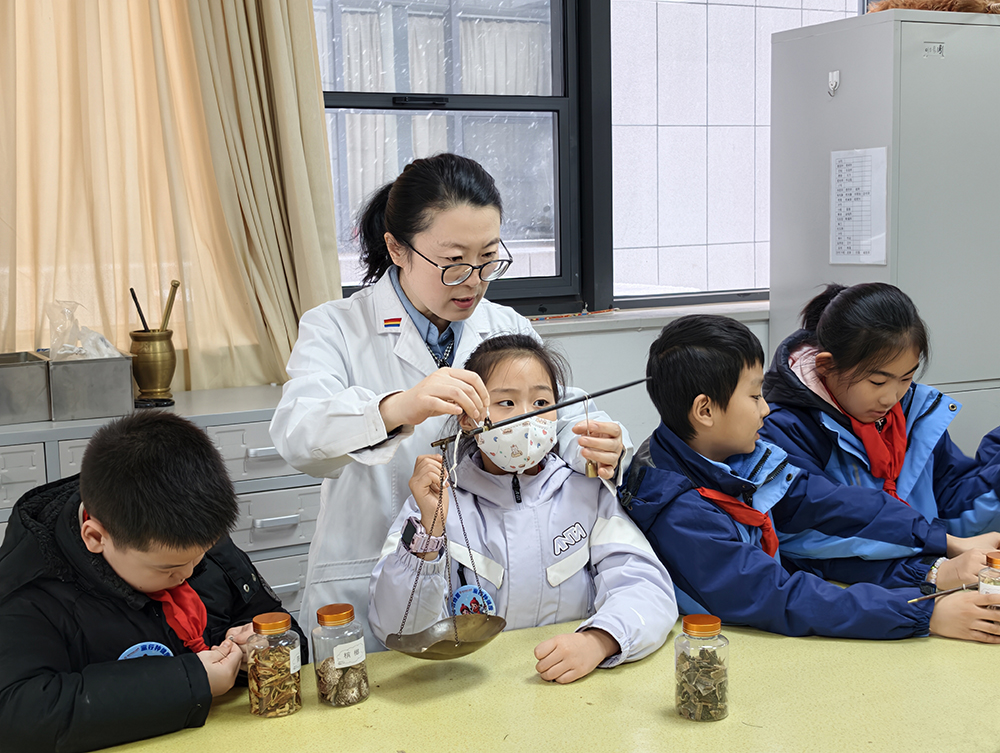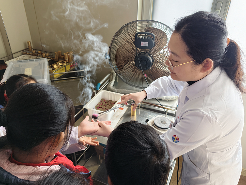午后的中醫(yī)文化體驗(yàn)環(huán)節(jié)充滿傳統(tǒng)韻味,孩子們化身“小小李時珍”,在中藥房辨識枸杞子、薏仁、黨參等常見中藥材,了解六味地黃丸“三補(bǔ)三瀉”的配伍原理,學(xué)習(xí)如何使用戥秤稱量藥材,現(xiàn)場用艾絨、丁香、薄荷等制作防風(fēng)寒中藥香包;在中醫(yī)門診,通過醫(yī)師的實(shí)踐教學(xué)與互動,孩子們親身體驗(yàn)艾灸、耳穴壓豆等中醫(yī)理療技術(shù),充分感受中醫(yī)文化的獨(dú)特魅力。