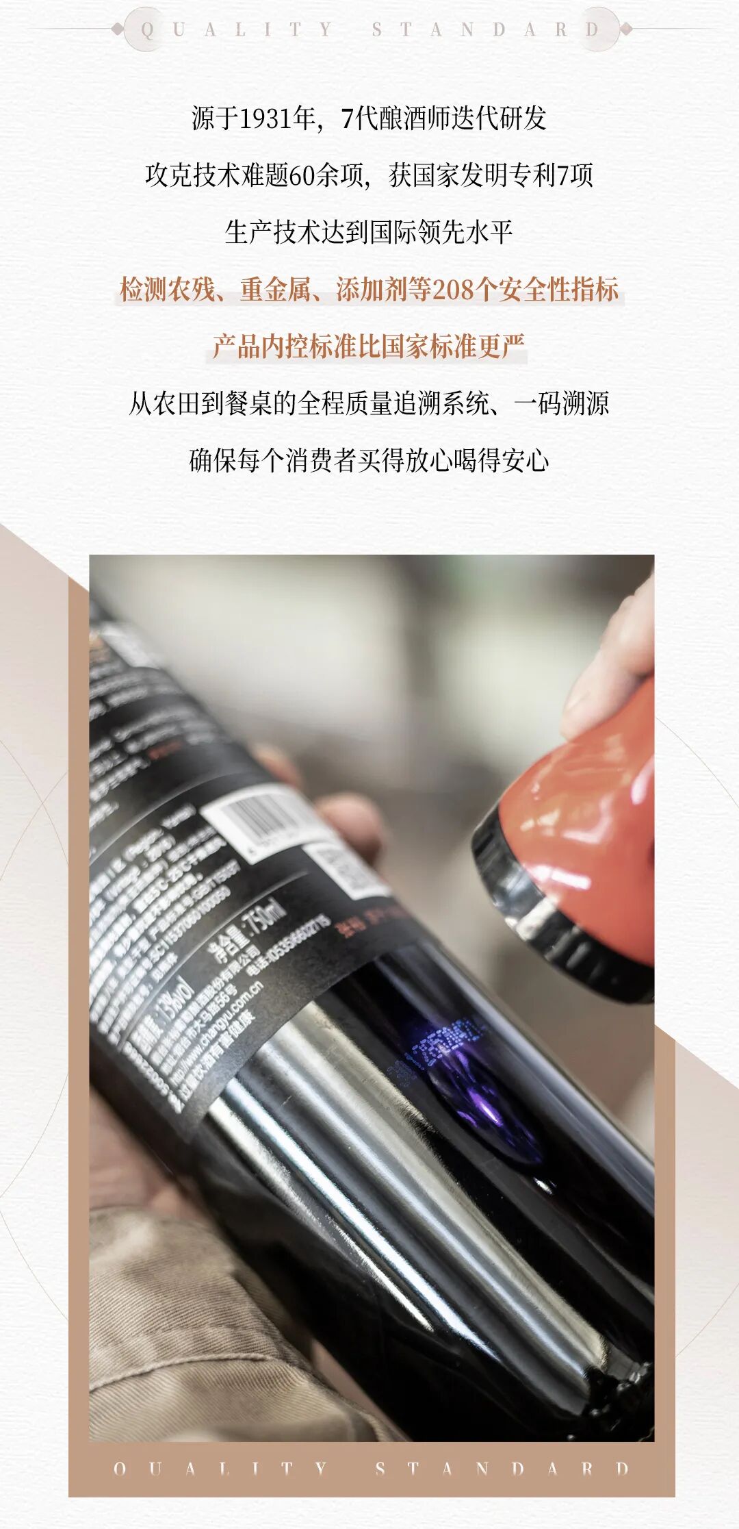 呈深寶石紅色,伴有濃郁的黑櫻桃、李子、樹莓等黑色水果香氣,果香與橡木桶陳年所帶來的巧克力、煙熏、雪松、煙草等香氣完美結(jié)合,單寧緊致且柔和,回味悠長(zhǎng),更加醇厚平衡,具有典型的品種陳年特性。